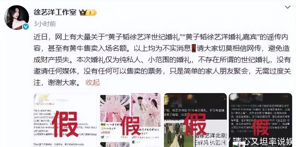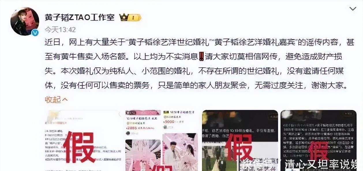 可让所有人没想到的是,就在事件曝光三小时后,黄子韬与徐艺洋直接发文辟谣。两人通过各自的工作室共同发文,否认了网上关于两人辟谣“世纪婚礼”、“婚礼嘉宾”等相关谣传,包括所谓的黄牛售卖入场名额,两人也表示属于不实消息,并号召所有人擦亮眼睛,避免造成财产损失。